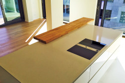 Doch nicht nur bei der Arbeitsplatte war Höchstleistung gefragt – auch für die flächenbündig eingebaute Spüle und Kochfelder war höchstes handwerkliches Geschick aus Kelkheim nötig. Die Kochfelder und das Dunstabzugssystem von BORA wurden in die Arbeitsplatte integriert. So konnte auf eine optisch störende Dunstabzugshaube an der Decke verzichtet werden und die großzügige Wirkung des Raums erhalten bleiben. Darüber hinaus bieten die mit hochwertigen Auszügen ausgestatteten Schränke im Inselbereich praktischen Stauraum.
